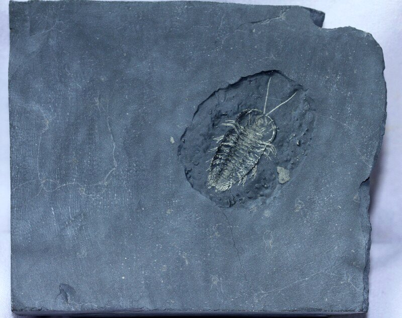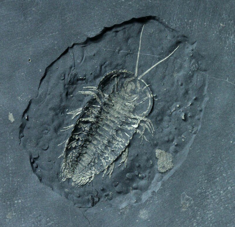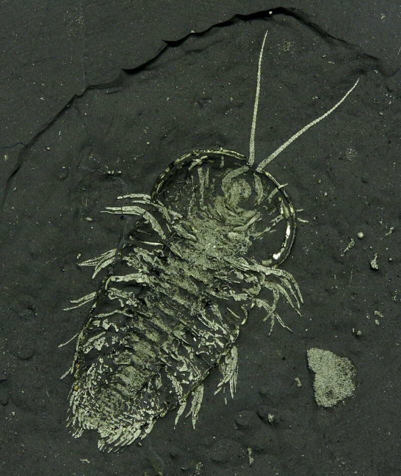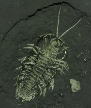 Triarthrus eatoniTrilobites Order Ptychopariida, Family Olenidae Geological Time: Late Ordovician Size (25.4 mm = 1 inch): Trilobite is 23 mm long with 10 mm antennae on a 75 mm by 90 mm matrix. Fossil Site: Lorraine Shale, Lewis County, New York Fossil Code: PYT109 Price: Sold |