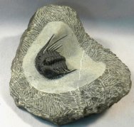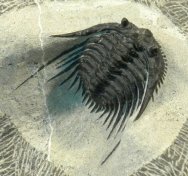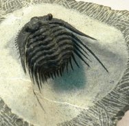 Leonaspis (or Kettneraspis) spTrilobites Order Lichida, Family Odontopleuridae Geologic Time: Middle Devonian Size (25.4 mm = 1 inch): Trilobite is 37 mm long by 32 mm wide (with spines) on a 75 mm by 90 mm matrix Fossil Site: Oued Ghris, Morocco Code: 13132 Price: $375.00 |
