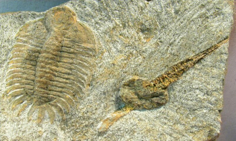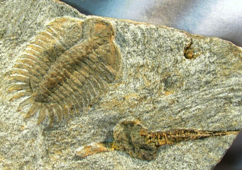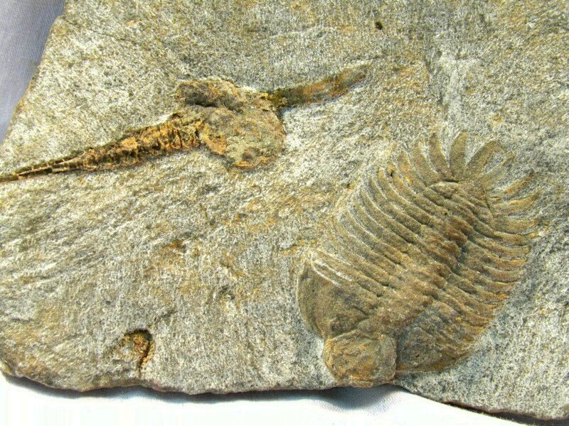 Pateraspis spTrilobites Order Phacopida, Family Cheiruridae Dendrocystites sp Deuterostomata, Class Homalozoa, Order Soluta Geological Time: Lower Ordovician Size (25.4 mm = 1 inch): Trilobite is 48 mm long by 33 mm wide (with spines) Cystoid: 65 mm overall on a 165 mm by 80 mm matrix Fossil Site: El Kaid Errami, Morocco Fossil Code: 13147 Price: Sold |