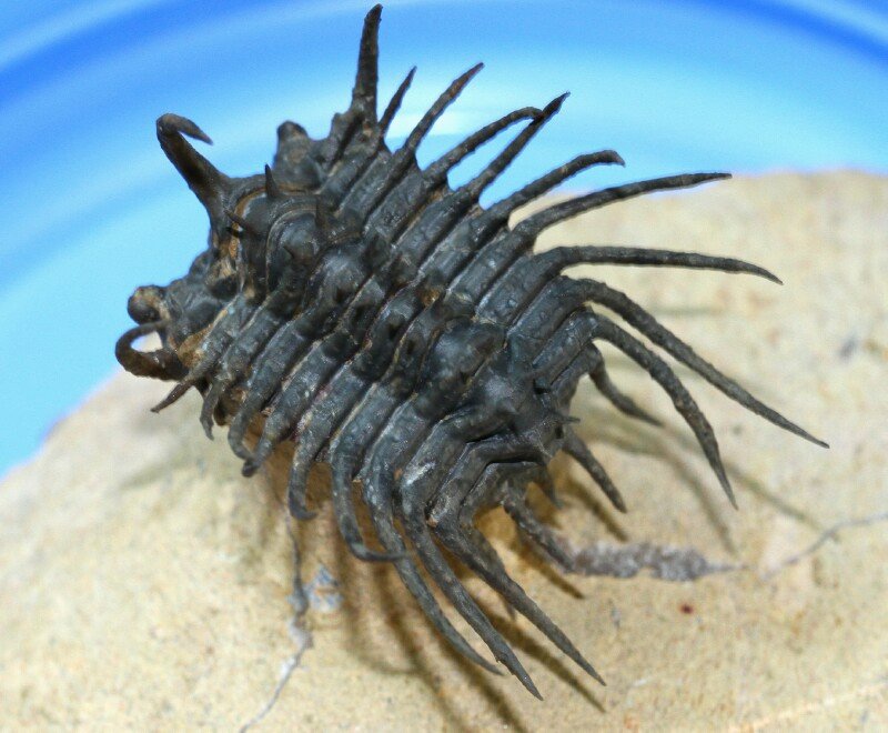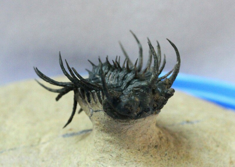 Koneprusia spTrilobites Order Odontopleurida, Family Odontopleuridae Geological Time: Lower Devonian Size (25.4 mm = 1 inch): Trilobite is 35 mm long by 30 mm wide (including spines) on a 75 mm by 70 mm matrix Fossil Site: Aatchana , Morocco Code: 12070 Price: Sold |