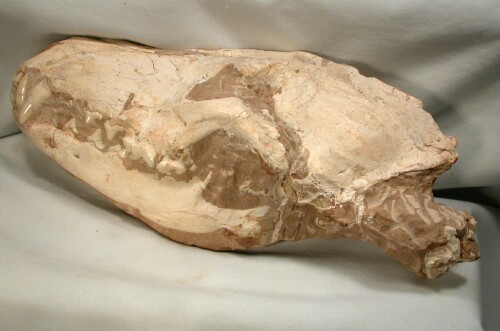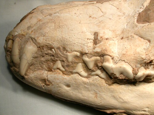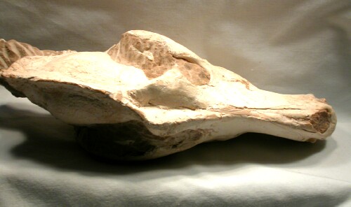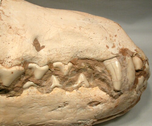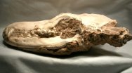 | Name: Carnivora; Canidae: Canis falconeri (fossil wolf skull) Age: Early Pleistocene Size (25.4mm=1 inch): Skull: 242 mm long (265 mm including attached vertebrae), 120 mm high, 100 mm across Location: Sanmen Formation , Xihe, Gansu Province, China Code: CF014 Price: $525.00 - Sold |