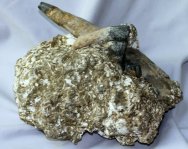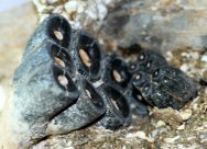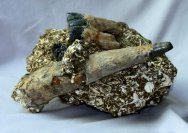 Desmostylus hesperusGeologic Time: Middle Miocene (~15 million years ago) Size (25.4 mm = 1 inch): Tusk: 220 mm (curve measure) by 45 mm base width Teeth: 30 mm by 16 mm by 16 mm high and 60 mm by 40 mm by 32 mm high (with 50 mm exposed root) Matrix: 200 mm by 110 mm by 110 mm high Fossil Site: Temblor Formation, Fresno County, California Code: GAF01 Price: Sold |