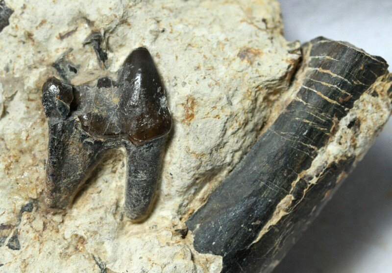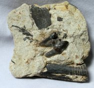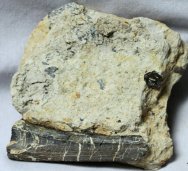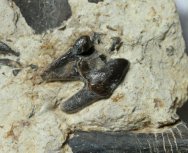 Hyaenodon requieniClass Mammalia, Order Creodonta, Family Hyaenodontidae Geological Time: Late Eocene (~36 million years ago) Size (25.4 mm = 1 inch): Tooth: 20 mm wide by 27 mm high (including root) Jawbone: 60 mm by 15 mm Matrix: Fossil Site: Euzet-les-Banes, Gard, France Fossil Code: FMT02 Price: $365.00 |