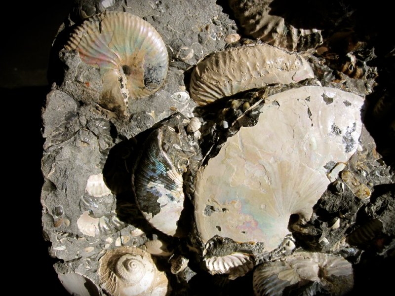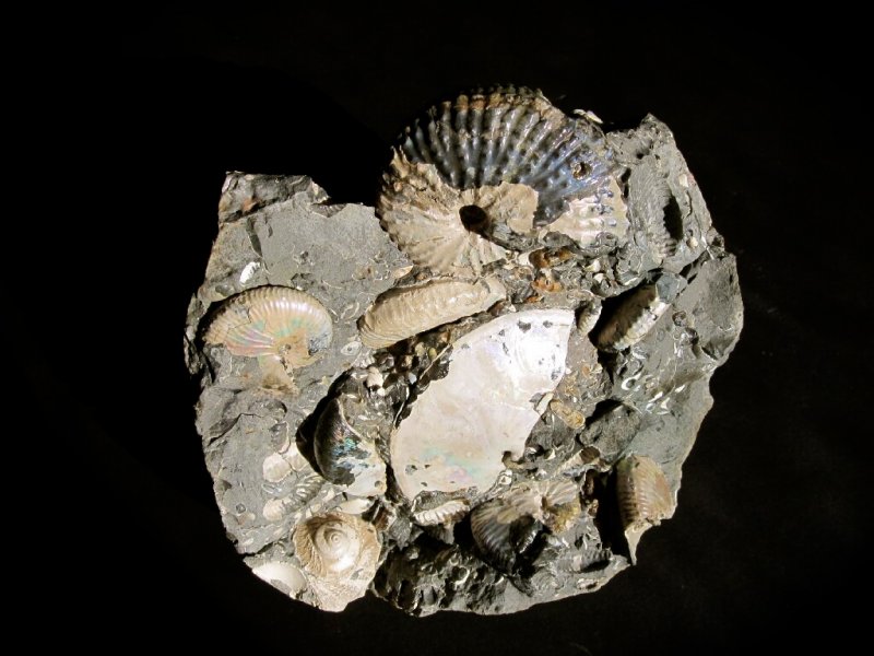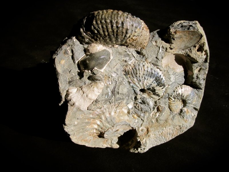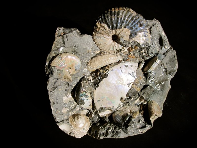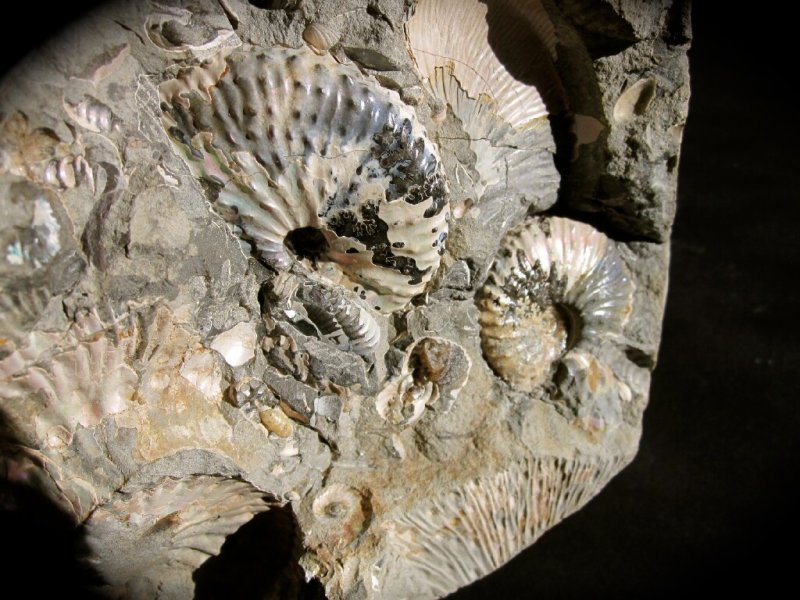 Holoscaphites nicolletti, Jeltzkytes spedeni, and Sphenodiscus lenticularis Scaphite FossilsPhylum Mollusca, Class Cephalopoda, Order Ammonitida, Family Scaphitidae Geological Time: Upper Cretaceous Size: The concretion measures 6 ½” wide by 7 ¼” high by 6” deep. The front side specimens measure by species diameter, Holoscaphites nicolletti 1 ½”, Jeltzkytes spedeni 3”, and Sphenodiscus lenticularis 3 1/8” Fossil Site: Fox Hills Formation, North Central South Dakota Fossil Code: PFA89 Price: $395.00 |