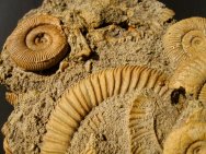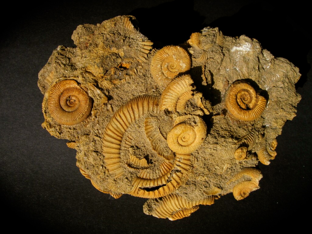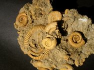Dactylioceras athleticumPhylum Mollusca, Class Cephalopoda, Subclass Ammonoidea, Family Dactylioceratidae Geological Time: Jurassic Size: The plate measures The plate measures 7 1/2” X 5 ½” x 2 1/4”. The specimens average 1/2” to 2 3/4” in diameter. There are approximately twelve partial to complete specimens on this life-like three dimensional hunk of matrix Fossil Site: Forcheim, Germany Fossil Code: PFA124 Price: Sold |