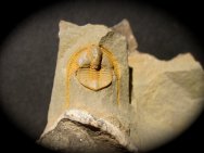 Cryptolithus bellulusTrilobite Order Asaphida, Family Trinucleidae Geological Time: Ordovician Size (25.4 mm = 1 inch): Trilobite is 5/8” in length by 5/8” in width on a small piece of matrix Fossil Site: Martinsburg Formation, Swatara Gap, Pennsylvania Code: PFT696 Price: Sold |