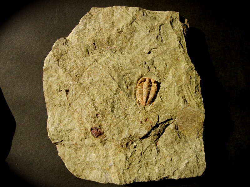 Bathycheilus cf. gallicusTrilobites Order Phacopida, Family Bathycheilidae Geological Time: Lower Ordovician Size (25.4 mm = 1 inch): Bathycheilus trilobite is 12 mm on a 12.5 x11 cm plate Fossil Site: Schistes des Fezouata Superieurs Formation, Dra Valley, Morocco Fossil Code: PFT465 Price: $180.00 |