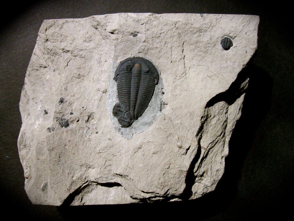 Altiocculus harrisi (formerly Alokistocare harrisi)Trilobites Order Ptychopariida, Family Alokistocaridae Geological Time: Middle Cambrian Size (25.4 mm = 1 inch): The Altiocculus trilobite is 1” in length. Bolaspidellas range from 1/8 to 3/16”. The plate size is 4 x 2 ¾”. Fossil Site: Wheeler Shale, House Range, Utah Code: PFT691 Price: Sold |