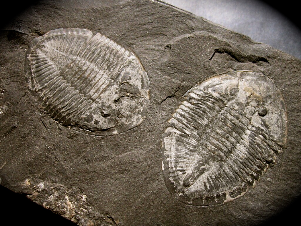 Pseudogygites latimarginatusTrilobite Order Asaphida; Family Asaphidae; Subfamily Isotelinae Geological Time: Upper Ordovician Size (25.4 mm = 1 inch): Trilobites are both 2 1/8” on a 5 ¾ x 3 Fossil Site: Collingwood Shale, Lindsay Formation, Ontario, Canadaay Hillier Member, Bowmanville, Ontario, Canada Code: PFT719 Price: Sold |