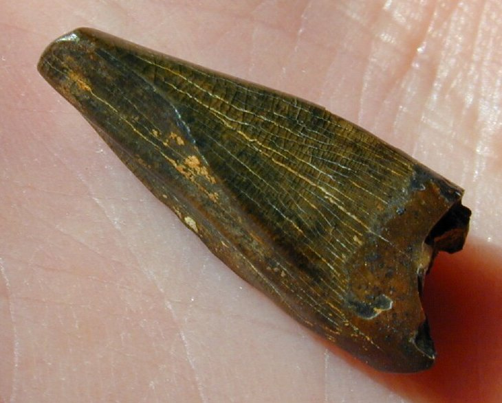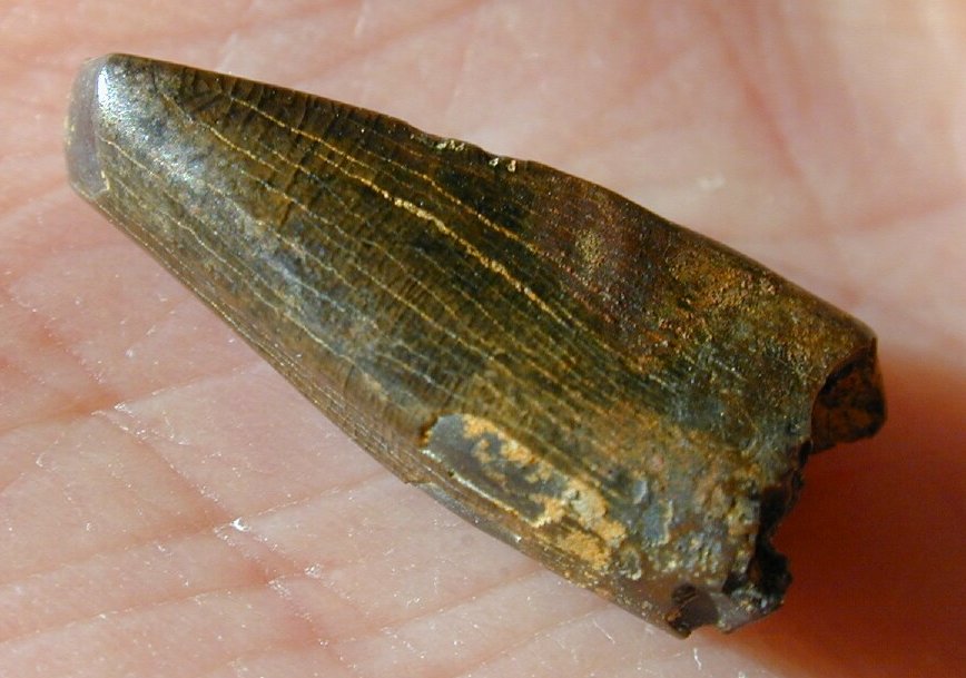 Nanotyrannus lancensis Dinosaur ToothClass Sauropsida, Superorder Dinosauria, Order Ornithischia, Suborder Theropoda, Family Tyrannosauridae Geological Time: Late Cretaceous (70 million years ago) Size: Dinosaur tooth is 18 mm in length (5/8”) Fossil Site: Hell Creek Formation, Butte County, South Dakota Fossil Code: PFV329 Price: Sold |