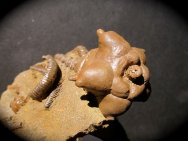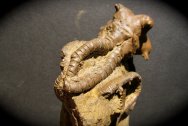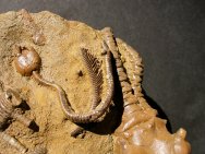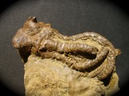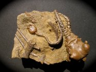 Jimbacrinus bostockiClass Crinoidea, Order Ampelocrinida, Family Calceolispongiidae NeocamptocrinusClass Crinoidea, Order Monobathrida, Family Dichocrinidae Geologic Time: Permian Size: The Jimbacrinus is 3 3/8” in length. The large crinoid would be 3 ½” if outstretched. A secondary calyx is ½” on the reverse side. The plate is a 4 ½” x 3” x 1 ¾ piece of flat lying matrix Fossil Site: Cundlego Formation, Gascoyne Junction, Western Australia Code: PFO461 Price: $825.00 |