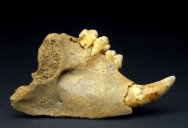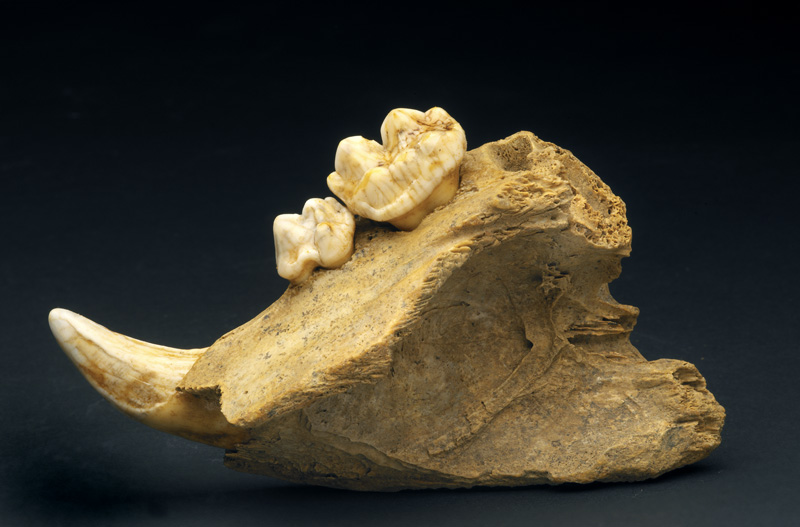 Ursus spelaeusOrder Carnivora, Family Ursidae Geological Time: Pleistocene Size: Fossil is 14.5 cm (5 3/4”) in length. The fang segment protruding from the jaw is 5 cm (2”0) Fossil Site: Romania Fossil Code: PFV200 Price: $230.00 |