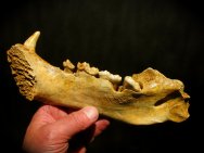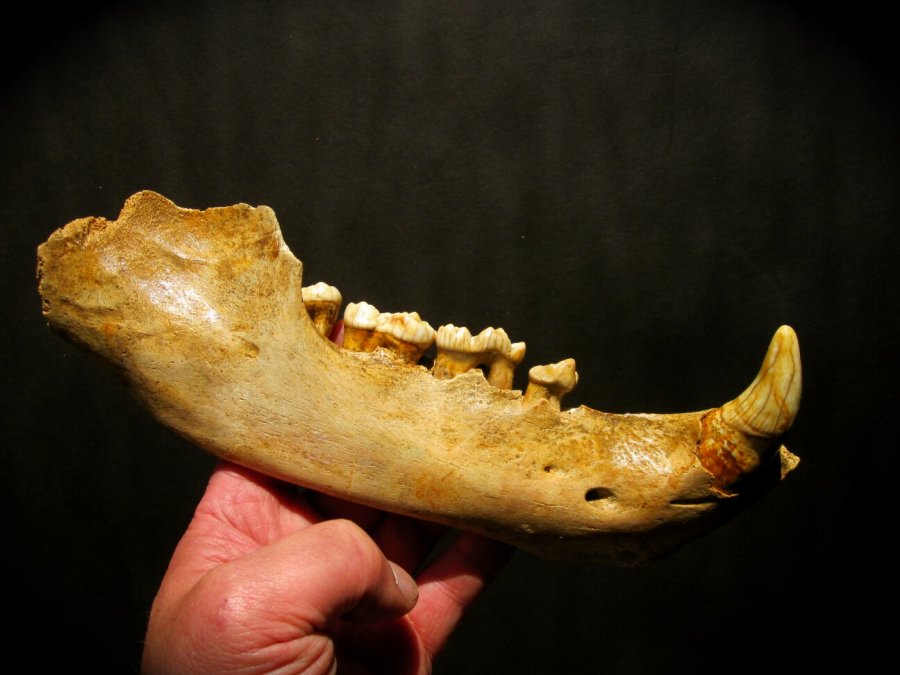 Ursus spelaeusOrder Carnivora, Family Ursidae Geological Time: Pleistocene Size: Jaw fossil is 24.1 cm (9 1/2”) in length. The fang segment protruding from the jaw is 5 cm (2”0). Fossil Site: Romania Fossil Code: PFV373 Price: Sold |