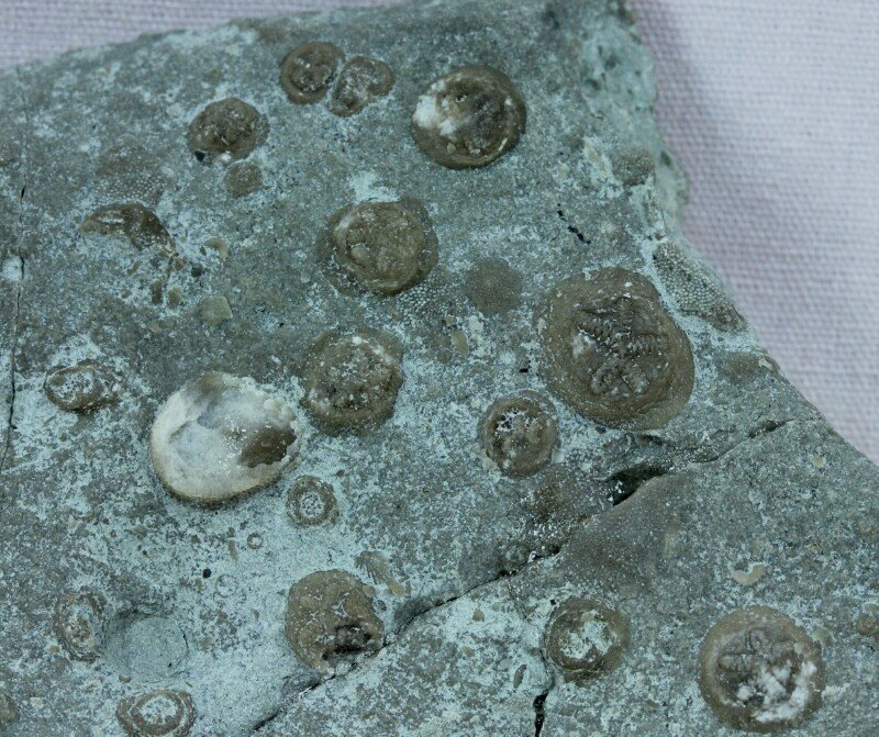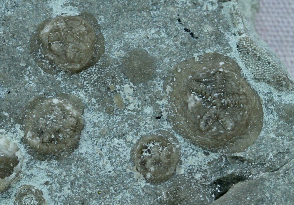 Isorophusella recondita and Cryptogoleus chapmaniPhylum Echinodermata, Subphylum Pelmatozoa, Class Edrioasteroidea, Family Isorophidae Geological Time: Middle Ordovician Size (25.4 mm = 1 inch): Fossils are 3-9 mm across Matrix: 60 mm by 75 mm Fossil Site: Verulam Formation, Lake Simcoe region, Quebec, Canada Code: MCF02 Price: Sold |