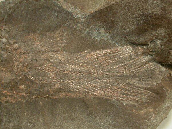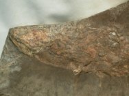 Cardiosuctor populosumClass Sarcopterygii, Subclass Coelacanthimorpha, Order Coelacanthiformes, Family Rhabdodermatidae Geological Time: Mississippian (~320 m.y.a.) Size: 198 mm Fossil Site: Taylor Formation, Bear Gulch Limestone, Fergus County, Montana |