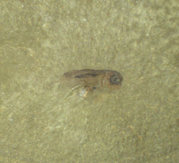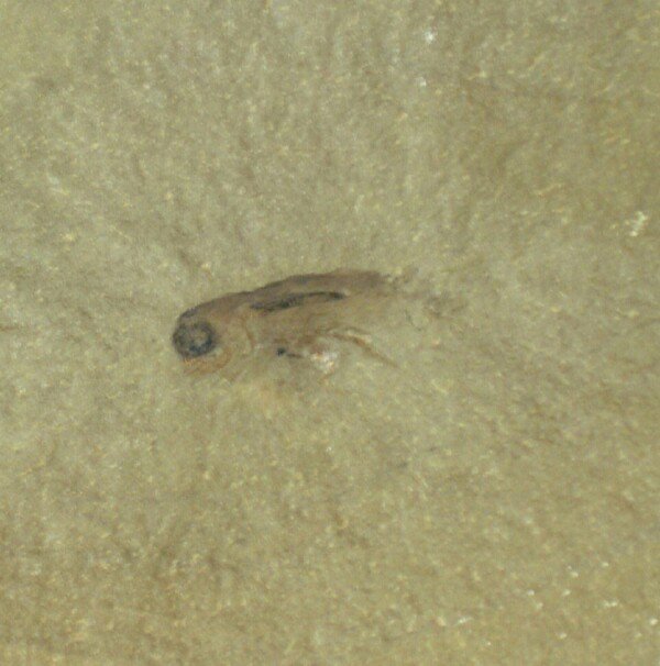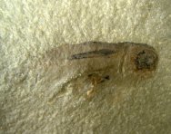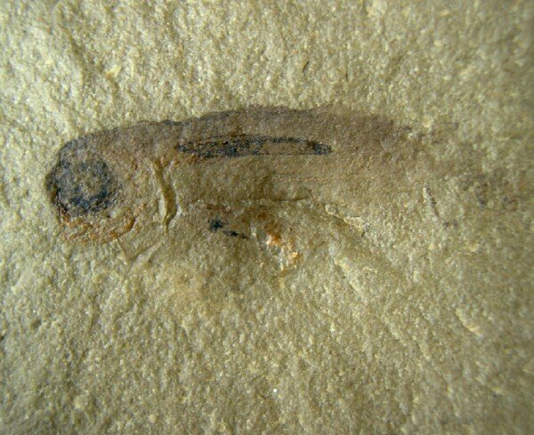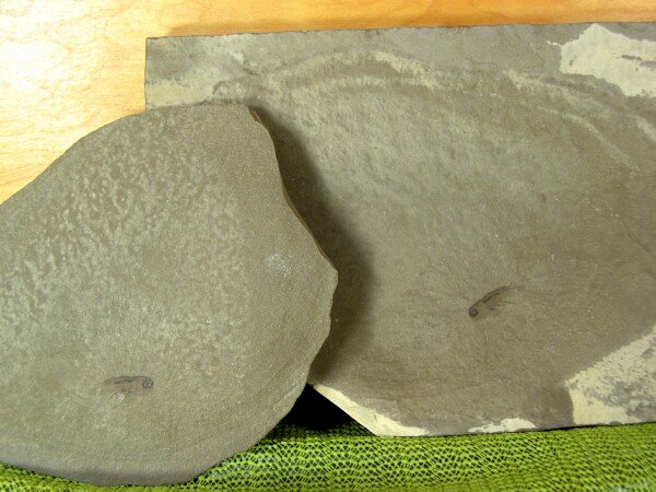 mm = 1 inch): Fish fossil: 22 mm long; Matrix: 250 mm by 175 mm and 185