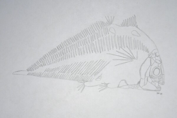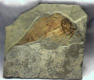 Allenypterus montanusCrossoptergyii, Coelacanthiformes, Hadronectoridae Geological Time: Mississippian (~320 m.y.a.) Size (25.4 mm = 1 inch): Fish fossil is 130 mm long (tip of nose to tip of tail along backbone) by 60 mm high on a 155 mm by 165 mm matrix Fossil Site: Heath Shale Formation, Bear Gulch Limestone, Fergus County, Montana |