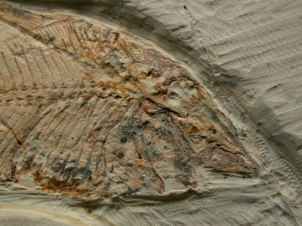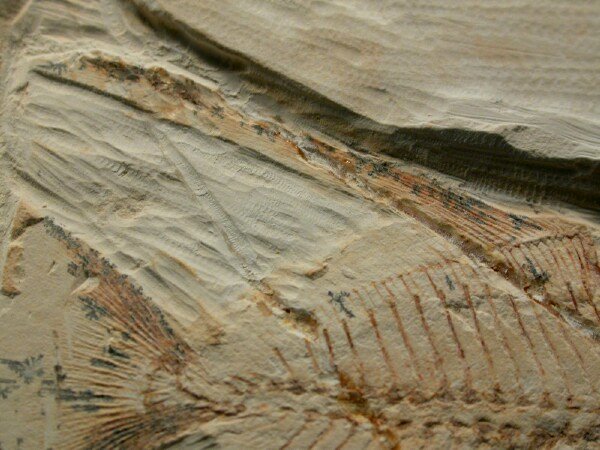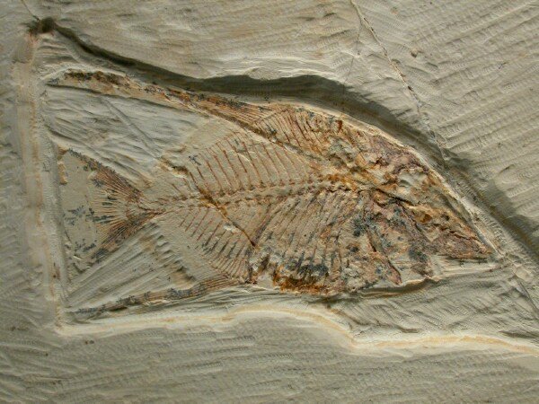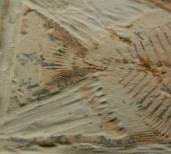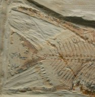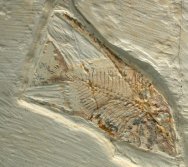 Pycnodontidae indet.Geologic Age: Cretaceous Size (25.4 mm = 1 inch): 87 mm in length by 45 mm tall (including fins) on a 230 mm by 160 mm matrix Fossil Site: Ramlia Taouz, Morocco |