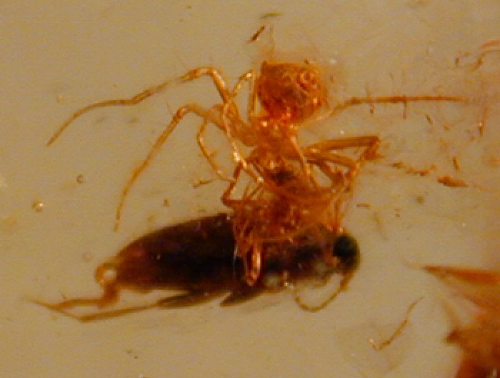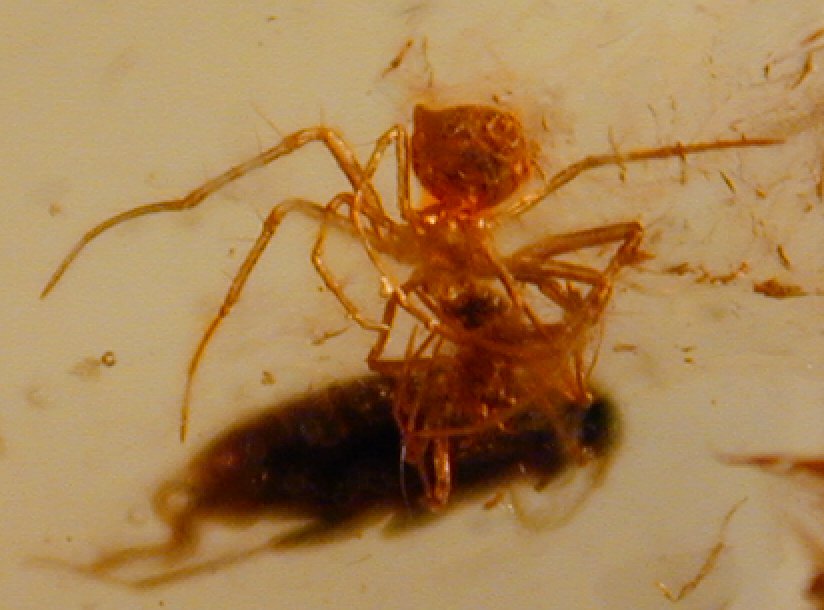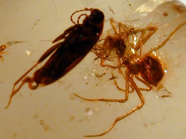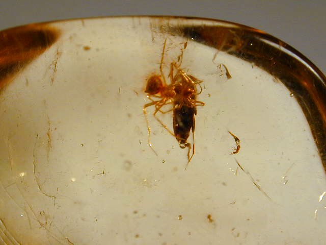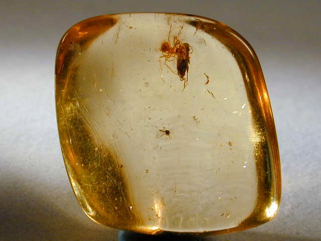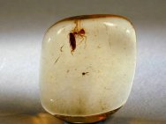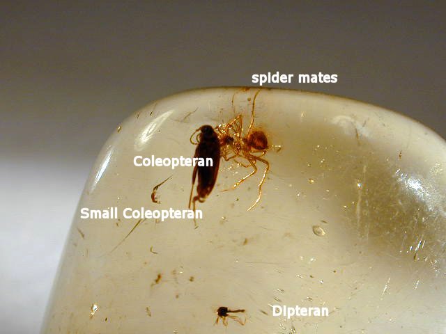 Amber Fossil Insects with Spiders (Coleoptera; Diptera)Geologic Time: Oligocene to Miocene Size: 22 by 20 by 9 mm Fossil Site: Region near Santiago, Dominican Republic |