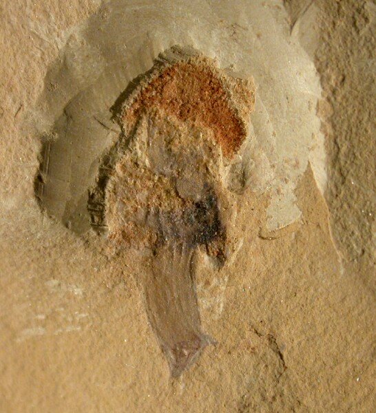 Archisaccophyllia kunmingensisPhylum Cnidaria Lingulella chengiangensisPhylum Brachiopoda Geological Time: Early Cambrian (~525 million years ago Size (25.4mm=1 inch): Archisaccophyllia: 16 mm long, 5 mm across Lingulella 26 mm long, 4 mm across on a 110 mm by 55 mm matrix Fossil Site: Chengjiang Maotianshan Shales - Quiongzhusi Section, Yu’anshan Member, Heilinpu Formation, Mafang Village, Anning, Kunming, Yunnan Province, China
