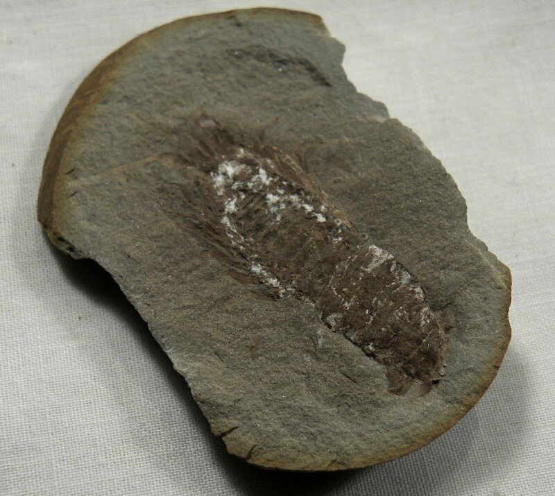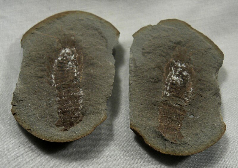 Mamayocaris jaskoskiiClass Crustacea, Order Pygocephalomorpha Geological Time: Pennsylvanian (~300 m.y.a.) Size: Fossil is 35 mm long by 12 mm across (plus antennae), Matrix: 50 mm by 35 mm nodule pair Fossil Site: Mazon Creek, Goose Lake, Morris, Illinois