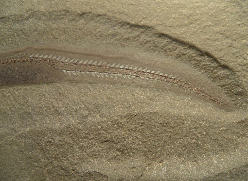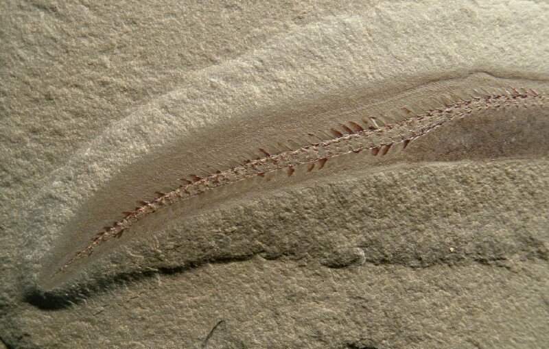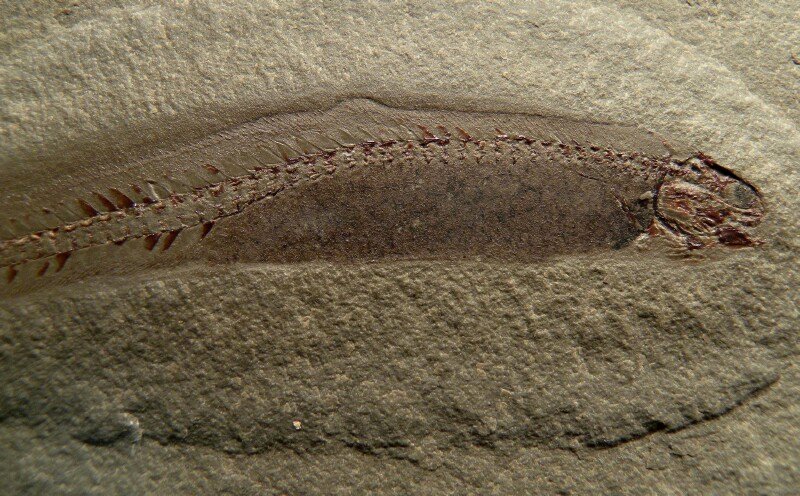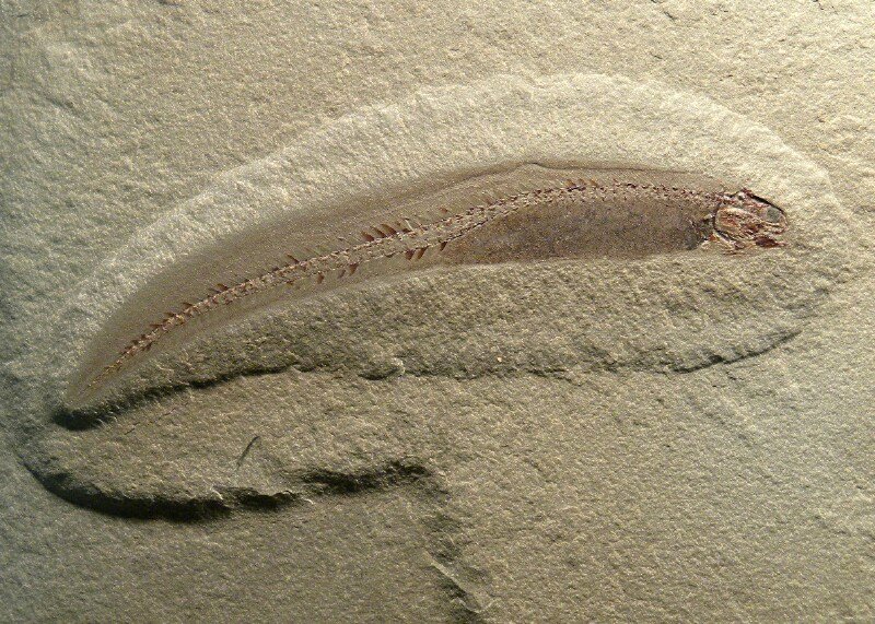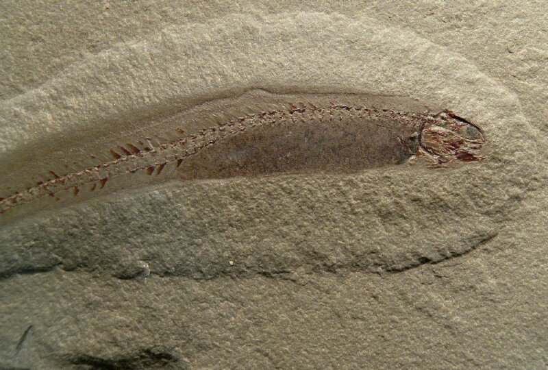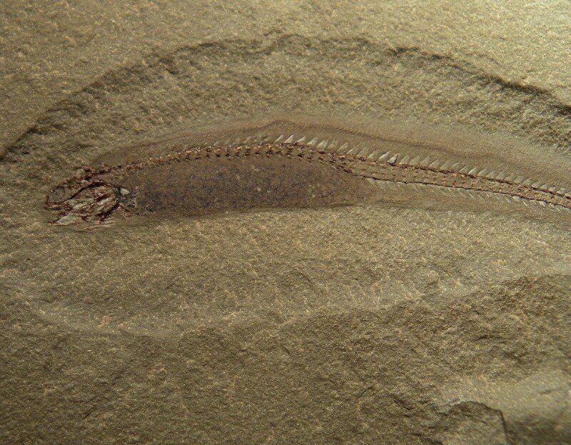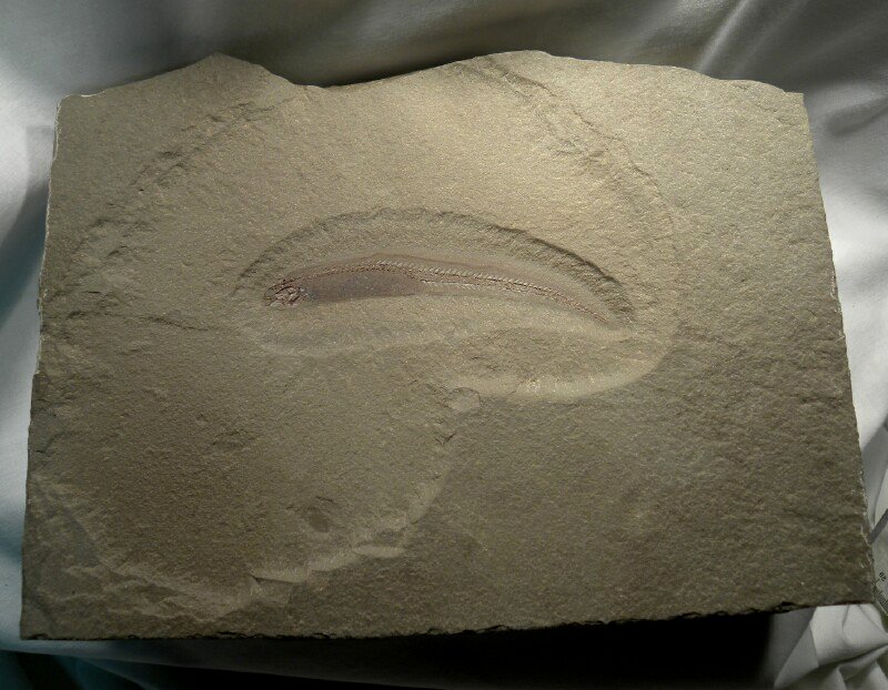 Apholodotus (Apholodotos) osnaClass Actinoptergyii, Order Terrasiiformes, Family Terrasiidae Geological Time: Mississippian (~320 m.y.a.) Size: Fish fossil: 108 mm long (tip of nose to tip of tail along backbone) on a 243 mm by 180 mm and 275 mm by 240 mm matrix Fossil Site: Heath Shale Formation, Bear Gulch Limestone, Fergus County, Montana
