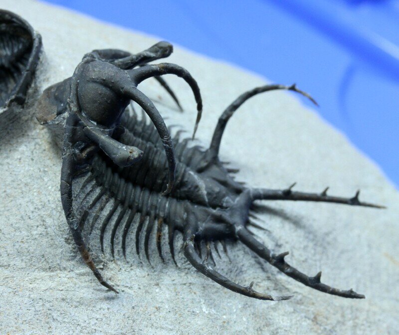 Ceratarges ziregensisTrilobites Order Lichida, Family Lichidae Phacops n. sp. AOrder Phacopida, Family Phacopidae Geological Time: Middle Devonian, Eifellian Stage Size (25.4 mm = 1 inch): Ceratarges: 48 mm long (curve measure) by 39 mm wide (including spines) Phacops: 35 mm by 20 mm on a 110 mm by 85 mm matrix Fossil Site: El Otfal Formation, Jebel Zireg , Morocco Fossil Code: 15027 Price: Sold |
