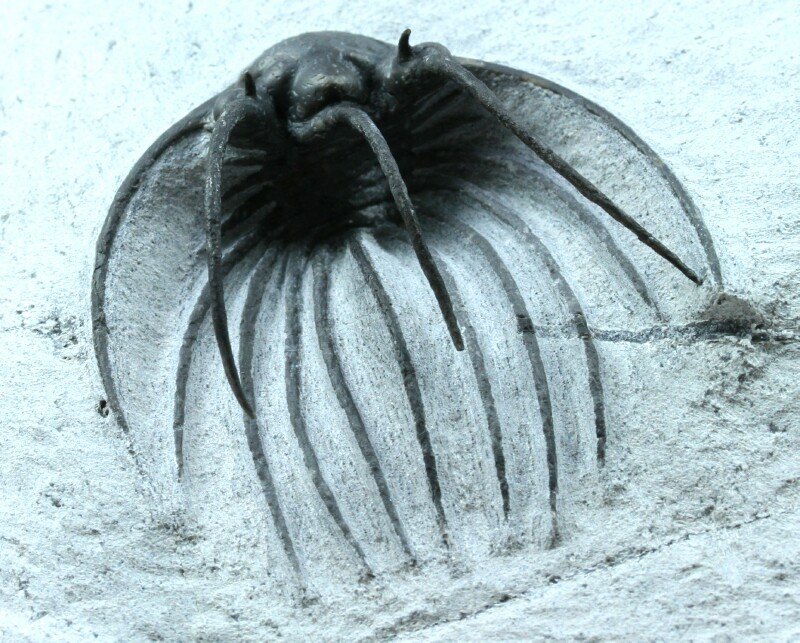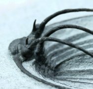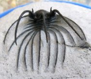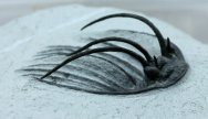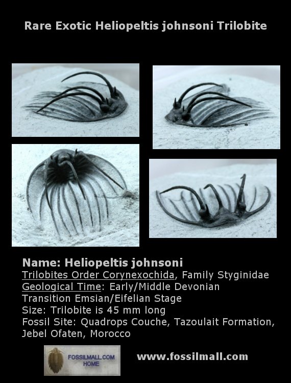 | Heliopeltis johnsoniTrilobites Order Corynexochida, Family Styginidae Geological Time: Early/Middle Devonian Transition Emsian/Eifelian Stage Size: Trilobite is 45 mm long Fossil Site: Quadrops Couche, Tazoulait Formation, Jebel Ofaten, Morocco |