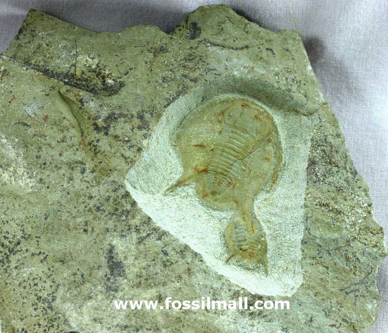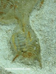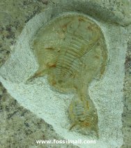 Richterops fallotiTrilobites Order Redlichiida, Superfamily Redlichioidea, Family Saukiandidae, Subfamily Resseropinae Geological Time: Lower Cambrian, Botomian Stage (~520 million years ago) Size (25.4 mm = 1 inch): Trilobite is 35 mm long, 30 mm across (with spines), Positive thorax: 12 mm by 10 mm, Negative posterior: 10 mm by 12 mm; Matrix: 115 mm by 115 mm. Fossil Site: Taroudant, Morocco Fossil Code: 15030 Price: Sold |