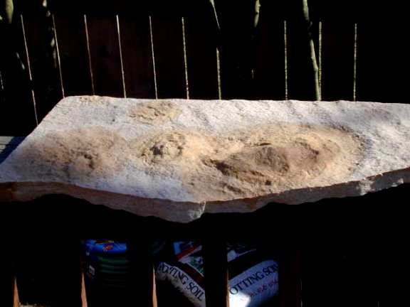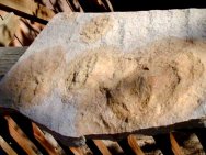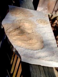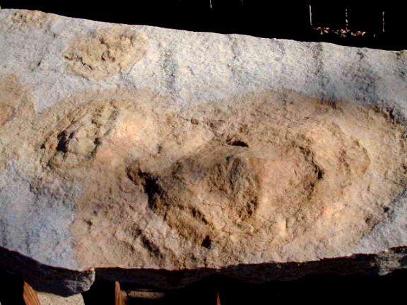 animals can be enormously successful. Here we have a sandstone plate with a large Madusae Cambrian Madusae Ichnofossil from an intriguing Cambrian site in Central Wisconsin. Being comprised entirely of soft tissue unlike animals with exoskeletons (e.g., trilobites) or skeletons (vertebrates), jellyfish fossils are body fossils that are impressions of the jellyfish. Such fossil impressions are rare, especially from the Cambrian. Jellyfish were some of the most ferocious preditors of the Cambrian marine environment. These fossils from the Wisconsin quarry are not just large for the Cambrian, but are the largest jellyfish in the entire fossil record. The epirelief preservation found in these jellyfish fossils was likely due to sediment that was trapped within the gastric cavity and/or attached to oral arms and lappets a the animal struggled after standing on a Cambrian shoreline. This mass mortality plate contains 4 madusae jelly fish fossils, plus a partial of a 5th Cnidarain. These jellyfish come from a particular horizon in the Mount Simon Sandstone formation that also yields facinating Diplichnites, Protichnites, and Climactichnites. Also see: Cambrian Shadows Madusae Jellyfish Fossils Hagadorn, J.W., Dott, R.H., and Damrow, D., 2002, Stranded on an Upper Cambrian shoreline: Medusae from Central Wisconsin: Geology, v. 30, p. 147-150. |