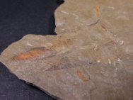 This plate has two larger Hyolithids. They come from the famous, Lower Cambrian, Pioche Shale in Nevada where they are sometimes found in association with Olenellid trilobtes. The long skinny trace to the right of the Hyolithids is a Priapulid worm gut trace. Add a new Class of fossil animal not often offered to your fossil collection. |