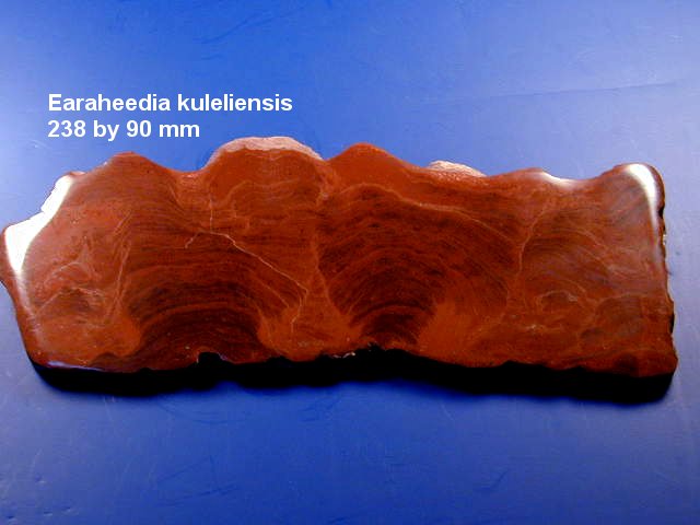 Name: Earaheedia kuleliensis Stromatolite Age: Paleoproterozoic (1.7 billion years old) Size: mm (25.4mm=1 inch): 240 by 90 (9 3/8 by 3 5/8 inches) Location: Kulele Limestone, Wiluna, Western Australia Code: DS173 Price: $90.00 |
