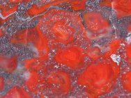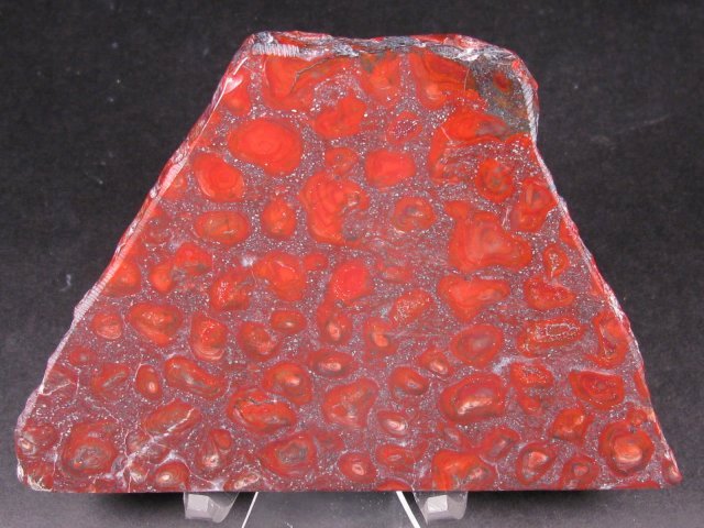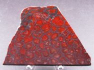 Stromatolites Collenia undosaAlso Known as Mary Ellen Jasper (an opaque red agate) Polished on both sides Geological Time: Precambrian (Proterozoic 2.2 - 2.4 Billion Years Old) Size: (25.4 mm= 1 inch): 130 mm across base; 4 mm thick Fossil Site: Biwabik Formation, Mary Ellen Mine, Mesabi Range, St. Louis County, Minnesota Fossil Code: DS2004 Price: $35.00 - sold |