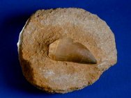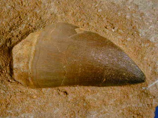 Halisaurus sp. ToothClass Sauropsida, Order Squamata, Family Mosasauridae, Subfamily Halisaurinae Geological Time: Upper Cretaceous Size (25.4 mm = 1 inch): 55 mm on 110 by 90 matirx Fossil Site: Khourigba, Morocco (phosphate deposits) Fossil Code: MT003 Price: $45.00 - sold This is a nice specimen of a complete tooth of a Mosasaur, a marine reptile predator that roamed that was unbiquitous on Earth during the era of the dinosaurs. It comes from the Late Cretaceous Phosphate deposits of Khourigba, Morocco. Mosasaur and Plesiosaur teeth teeth are very abundant from the phosphate deposits of Khourigba, Morocco. Moreover, fossils from this site that are in matrix are almost surely remounted, but there is no way to tell. Finally, we've seen these fossils grossly overpriced by some, with banal accolades such as "investment quality". These are nice and inexpensive fossils, so please don't be drupped and overpay. |