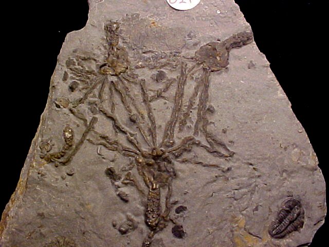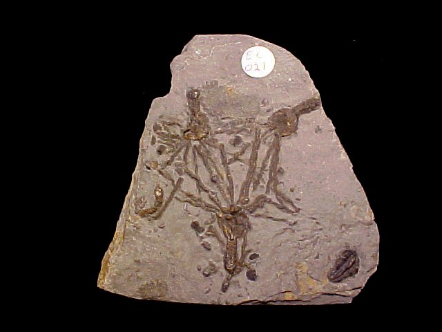 Name: Gogia spiralis; Echinodermata: (also called Dawn Crinoid); Trilobita Order: Ptychopariida; Family Menomoniidae; Bolaspidella housensis Age: Upper Eocene Size (25.4 mm = 1 inch): Matrix 60mm X 65mm Largest gogia 34mm; Bolaspidella 9mm brachiopods 2mm Location: Wheeler Shale, Millard County, Utah Code: EC021 Price: $110.00 - sold