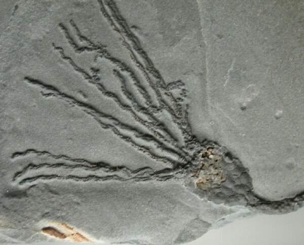 Gogia spiralis (also called Dawn Crinoid)Echinodermata, Eocrinoidea Geologic Time: Middle Cambrian Size (25.4 mm = 1 inch): 37 mm long and 32 mm wide on a 50 mm by 70 mm matrix Fossil Site: House Range, Wheeler Shale, Millard County, Utah Fossil Code: EC0122 Price: $65.00 - sold |