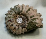 Douvilleiceras mammilatumGeologic Time: Upper Early Cretaceous, Albian Stage Size (25.4mm=1 inch): 55 mm diameter, 25 mm across living chamber Fossil Site: Mahajanga Province, Madagascar Fossil Code: AM020 Price: $35.00 - sold