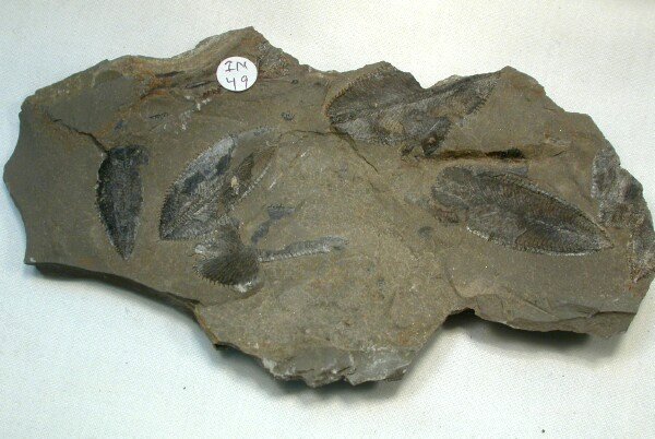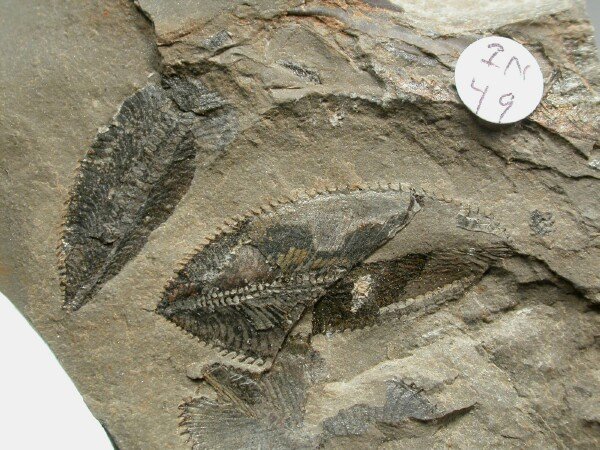 Phyllograptus archaios GraptolitesPhylum Hemichordata; Graptolithina Geologic Time: Lower Ordovician Size (25.4 mm = 1 inch): Graptolites 22-35 mm on a 130 mm by 65 mm matrix Fossil Site: Fillmore Formation, Millard County, Utah Code: IN049 Price: Sold |