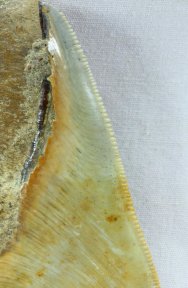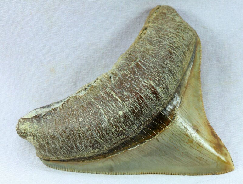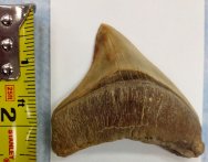 Carcharocles (Carcharodon) megalodon shark toothClass Chondrichthyes, Subclass Elasmobranchii, Superorder Selachimorpha, Order Lamniformes, Family Otodontidae Geological Time: Pliocene (~3 million years ago) Size (25.4 mm = 1 inch): Megalodon tooth is 65 mm long, 72 mm wide (maximum); Crown: 70 mm slant length by 72 mm wide at root Fossil Site: Huarra Formation, Atacama Desert, Chile Code: KZC05 Price: Sold |