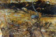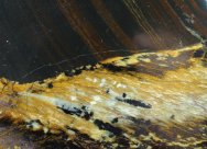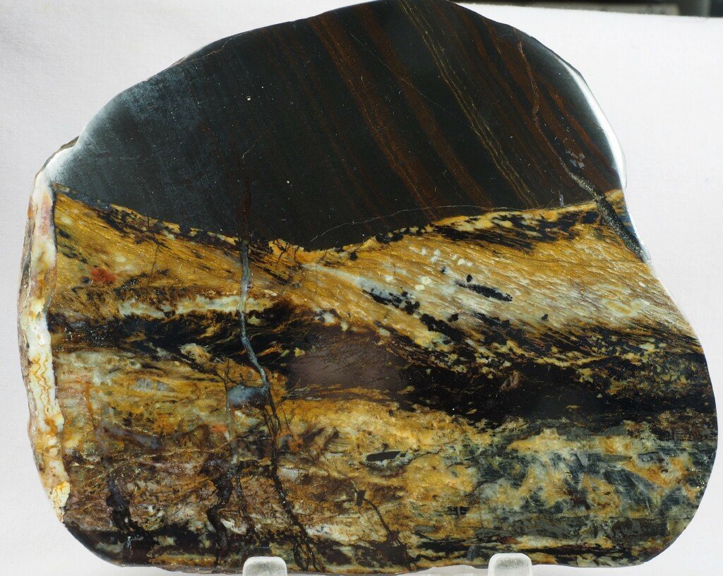 Stromatolites - Banded Iron Deposit with Hydrothermal Silkstone IntrusionHand Polished Geological Time: Early Proterozoic, ~ 2.0 to 2.2 Billion Years Old Size: Stromatolite fossil is 130 mm by 110 (maximum) Fossil Site: Merritt #2 Mine, Cayuna North Range, Crow Wing County Minnesota Code: DS17011 Price: Sold |