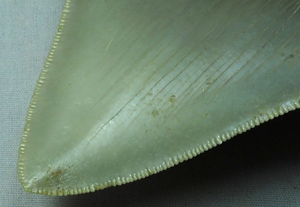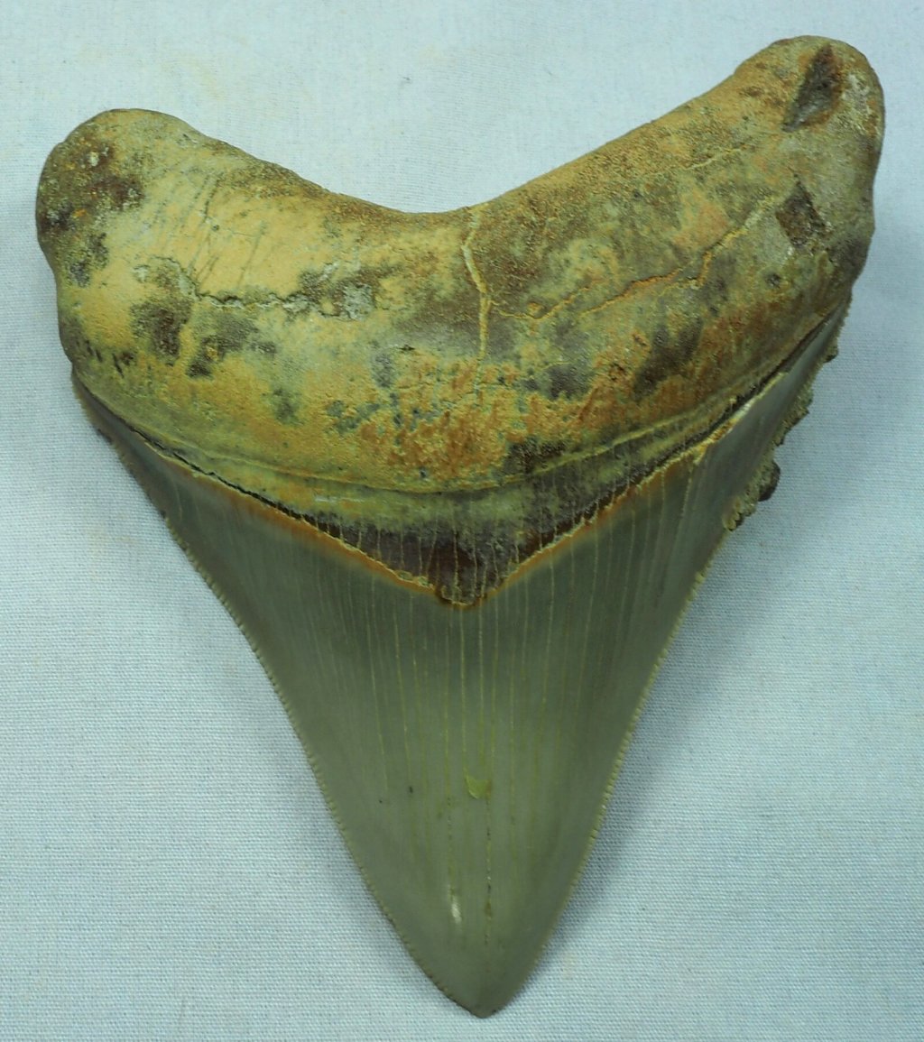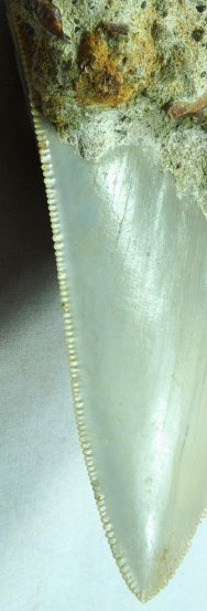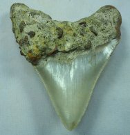 Carcharocles (Carcharodon) megalodon shark toothClass Chondrichthyes, Subclass Elasmobranchii, Superorder Selachimorpha, Order Lamniformes, Family Otodontidae Geological Time: Pliocene (about 3 million years ago) Size (25.4 mm = 1 inch): Megalodon tooth is 110 mm long , 92 mm wide (maximum) Crown: 79 mm slant length by 80 mm wide at root) Fossil Site: Huarra Formation, Atacama Desert, Chile Code: KZC23 Price: Sold |