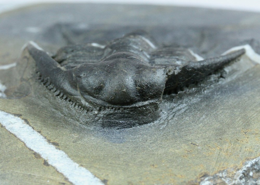 Chlustinia keyserlingiTrilobites Order Lichida, Family Odontopleuridae Geological Time: Ordovician Size (25.4 mm = 1 inch) Trilobite is 55 mm long by 37 mm wide on a 100 mm by 87 mm matrix Fossil Site: Tazarine , Morocco Code: 15129 Price: Sold |