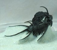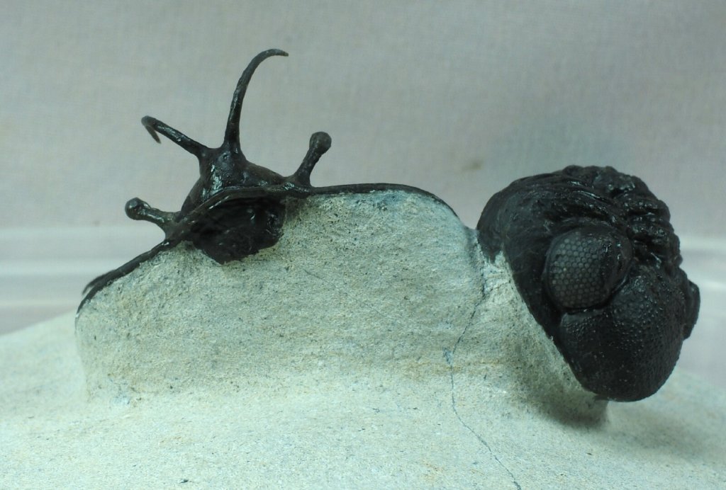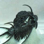 Ceratarges ariesTrilobites Order Lichida, Family Lichidae Aff Boeckops stelckiTrilobites Order Phacopida, Family Phacopidae Geological Time: Middle Devonian, Eifellian Stage Size mm (25.4mm=1 inch) Ceratarges: 60 mm long (curve measure) by 45 mm wide (including spines) Boeckops : 58 mm long (curve measure) by 30 mm wide on a 110 mm by 105 mm matrix. Fossil Site: El Otfal Formation, Serdrare, Tazarine, Morocco Fossil Code: 16183 Price: Sold