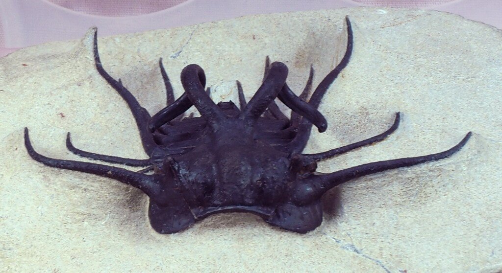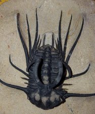 Dicranurus monstrosusTrilobites Order Lichida, Family Odontopleuridae Geological Time: Lower Devonian Size: Trilobite is 63 mm long by 74 mm wide (with spines) on a 90 mm by 80 mm matrix.. Fossil Site: Aatchana, Morocco Fossil Code: 16188 Price: $950.00 |