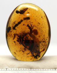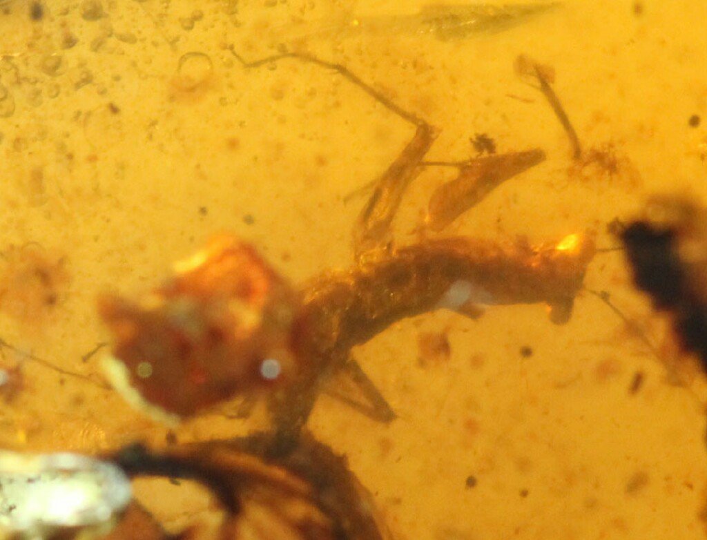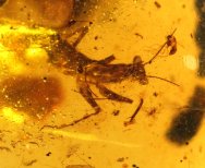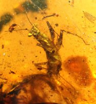 Mantis in Fossil Amber (praying mantis)Class Insecta, Order Mantodea Geological Time: Late Cretaceous, Cenomanian Stage (~ 100 million years ago) Size: Amber: 25 mm long by 18 mm across, Inclusion: 6 mm (with antennae) Fossil Site: Hukawng Valley, Kachin State, Myanmar Code: MYA21 Price: Sold