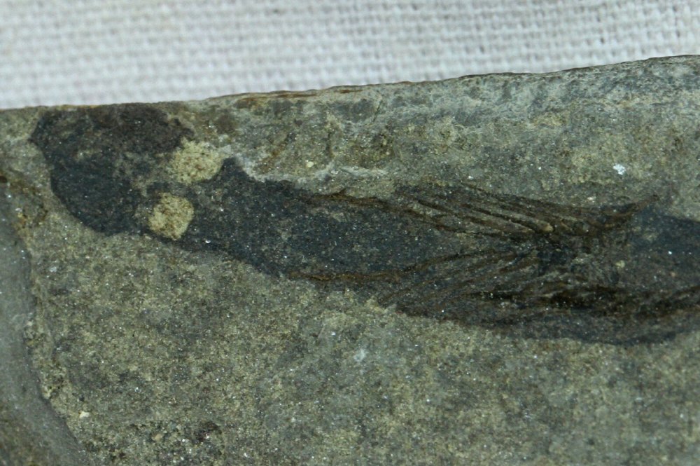 mm = 1 inch): Fish fossil is 32 mm in length on a 52 mm by 22 mm matrix