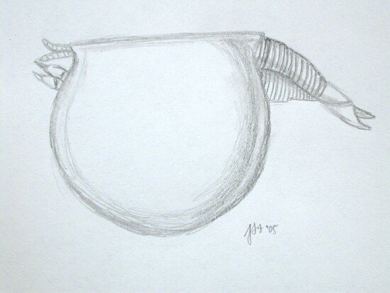 Branchiocaris spPhylum Arthropoda, Subphylum Crustacea, Class Malacostraca, Class Phyllocarida Geological Time: Middle Cambrian (~520 million years ago) Size (25.4 mm = 1 inch): Fossil is 75 mm long by 30 mm across and 78 mm long by 20 mm across on a 135 mm by 120 mm matrix Fossil Site: Wheeler Shale, Millard County, Utah Code: ND015 Price: $335.00 - sold |